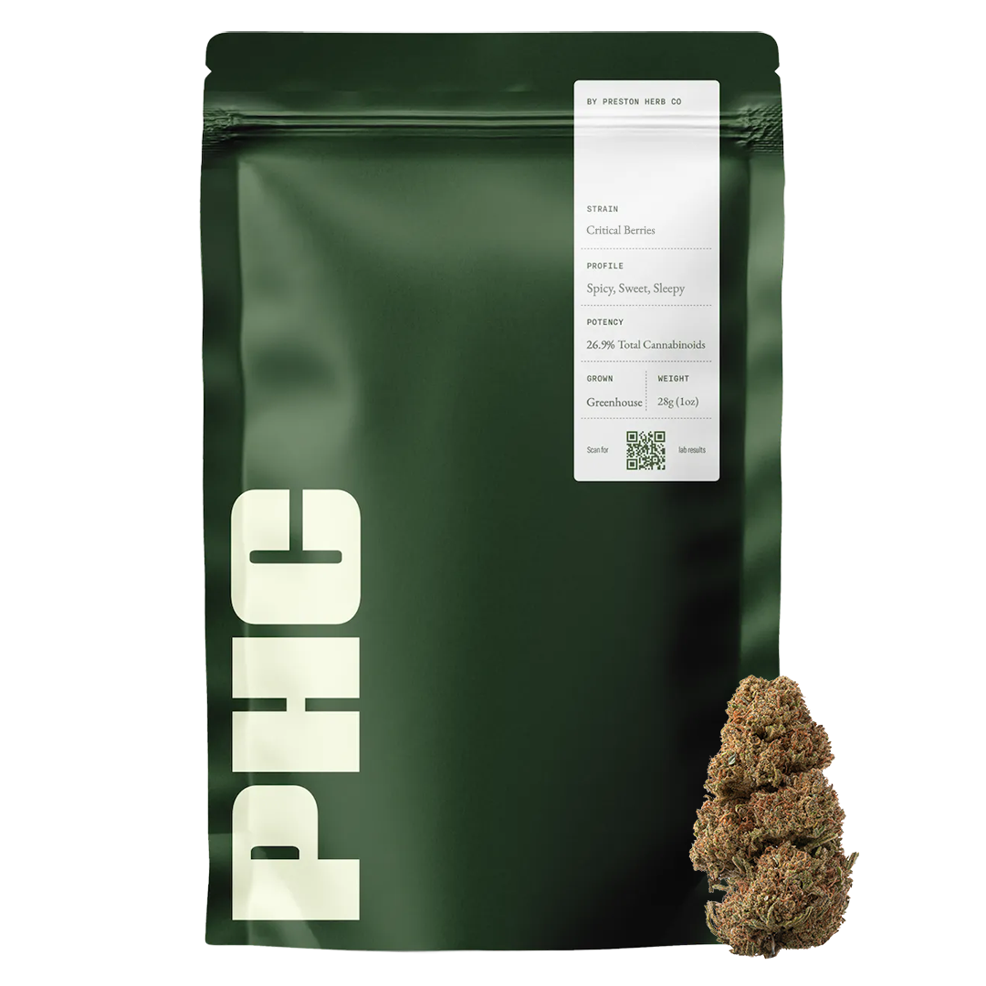 Sungrown CBD flower cultivated under full-term sun exposure, producing structured buds with a natural finish and a terpene profile that leans savory, earthy, and slightly pungent. Critical Berries is crafted for smooth, functional relaxation without dulling your edge. It opens with a clean sense of calm that settles the body while keeping the mind engaged for easy, everyday focus. Expect a session that feels steady and polished, ideal for easing stress without heavy sedation.